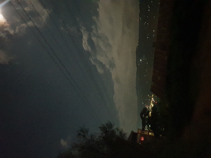 A low-angle shot captures a night scene. A statue stands atop a building with a visible red light. Power lines crisscross the dark sky where scattered stars peek through clouds. A dark, blurred form occupies the right edge of the frame. In the distance, faint lights dot the mountainside. Trees are silhouetted in the foreground. The image has a shadowy, mysterious quality.