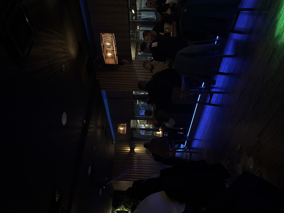 The image displays the dimly lit interior of a commercial establishment, likely a bar or lounge, located in Sliven, Bulgaria. Approximately 15 to 20 individuals, primarily adults, are visible within the scene, engaged in social activity. Most subjects are seated on bar stools along a prominent counter or bar that extends across the middle ground, illuminated by a continuous blue LED strip light at its base. The environment features a dark ceiling with embedded circular lights and two distinct circular pendant lamps with woven material shades, emitting warm light. Walls are characterized by vertical wooden paneling and additional warm-toned wall sconces. A section of artificial greenery is observed on the far left. The flooring consists of dark wooden planks, with a faint green light reflection present in the immediate foreground. Large windows in the background reveal a dimly lit urban exterior, consistent with nighttime conditions. Subjects are positioned in various states of interaction, appearing to converse and consume beverages, with glasses and bottles visible on surfaces. Coats and jackets are draped over some of the bar stools. No specific actions beyond typical social congregation in a bar setting are discernible.