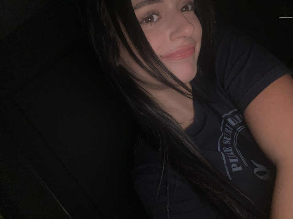 A young woman with long, dark hair smiles faintly. She is wearing a navy blue T-shirt with faded lettering, partially visible. The background is mostly dark and out of focus. The lighting is dim, casting soft shadows on her face and shoulder.
