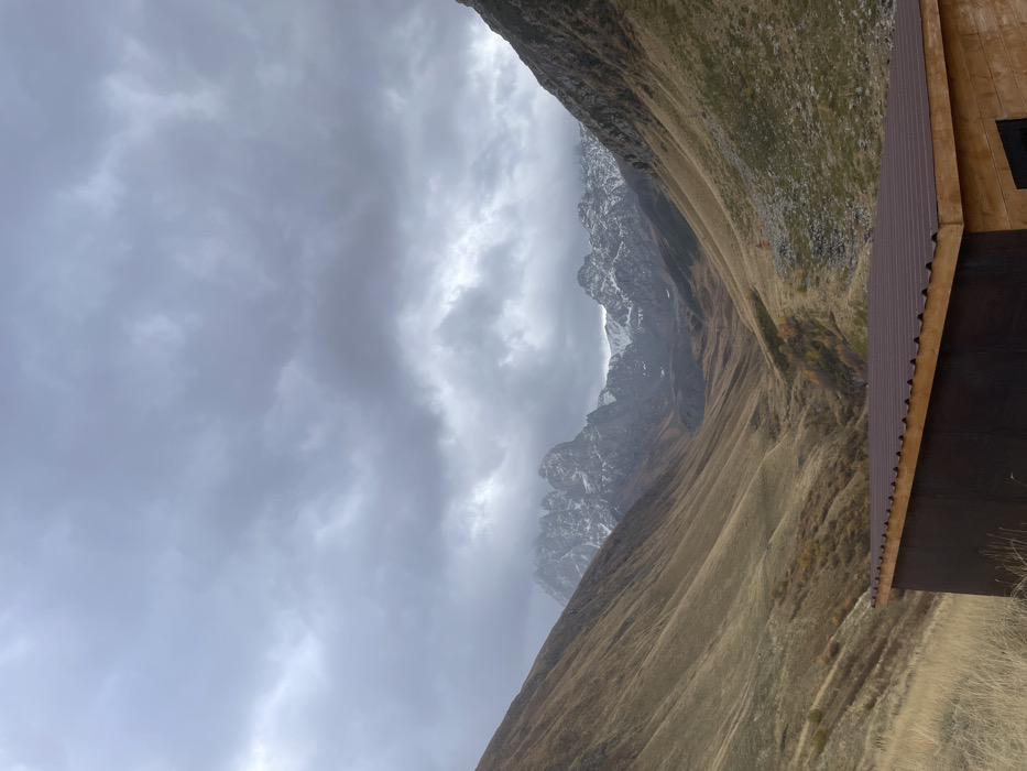 The image displays a deep mountain valley in Juta, Georgia, under a heavily overcast sky. Dense, dark gray clouds cover the majority of the sky. Two prominent mountain slopes, covered in dry, golden-brown grasses and patches of scree, frame a V-shaped valley receding into the distance. In the mid-ground and background, multiple jagged peaks are visible, several exhibiting distinct snow caps and ice patches, with one central peak partly obscured by cloud cover. The valley floor in the mid-distance contains scattered darker vegetation. In the lower foreground, the upper portion of a rectangular building is present, featuring dark brown walls, a reddish-brown corrugated metal roof with a light-colored fascia, and a small black rectangular opening on its visible right side. No people, specific actions, or interactions are depicted.