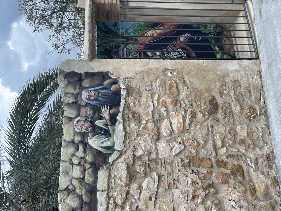 A stone facade features a trompe-l'oeil painting of two men looking out from a simulated broken wall. The upper man has a long gray beard and a fearful expression. The lower man, with similar distress, appears to be pushing upward. Above, behind a wrought-iron railing, is a painted scene, possibly depicting a Spanish conquistador figure. A palm tree stands nearby, and cloudy skies are visible above.