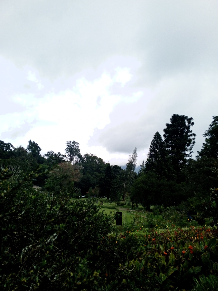 A landscape with a dense assortment of greenery, including bushes, flowers with reddish blossoms, and tall trees, is presented beneath a cloudy sky. The trees in the distance gradually recede into the horizon, where the sky is heavily overcast. A grassy lawn area can be seen through openings in the foliage. The composition suggests a natural garden or park setting, captured on an overcast day.