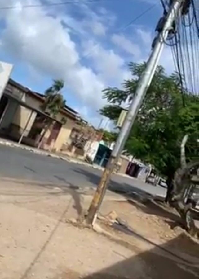 street scene with a clear sky above and a mix of sunlight and shadows on the ground. A utility pole with wires is visible, along with a sign advertising water refills. The buildings along the street appear to be a mix of residential and commercial properties. There are plants and trees adding greenery to the scene. In the distance, people can be seen sitting. The road is paved, and the side of the road appears to be dirt.