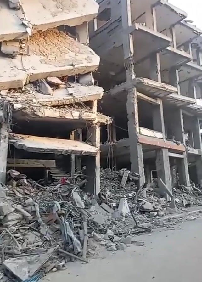 street surrounded by heavily damaged buildings. The buildings are mostly concrete, with many floors collapsed or partially destroyed. There is a large pile of rubble on one side of the street, consisting of broken concrete, metal, and other debris. A group of people can be seen walking in the distance on the road, with the destruction lining both sides of the street. The overall impression is one of devastation and destruction.