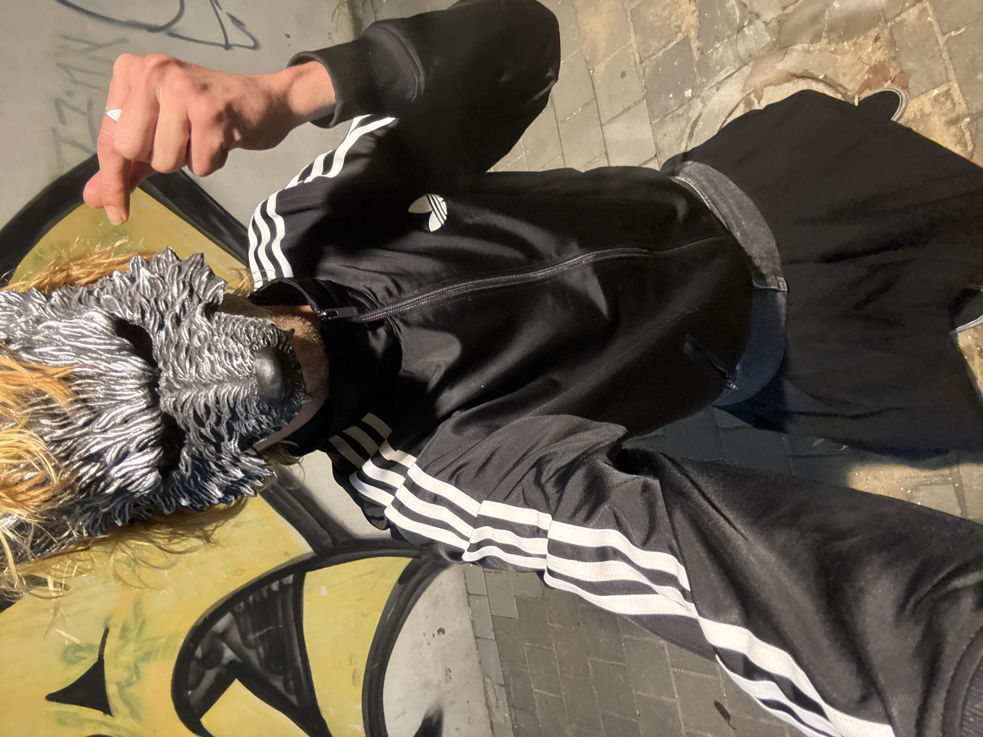 A single individual is depicted in an urban setting at night, located in Tel-Aviv, Israel. The person wears a detailed, silver-gray wolf mask covering their entire face, with messy, light-colored hair visible around the top and sides of the mask. They are dressed in a black Adidas track jacket with a white trefoil logo on the left chest and three white stripes running down each sleeve. Below the jacket, a black skirt-like garment is worn over what appears to be black Adidas track pants with white stripes, secured by a dark belt. The person's right hand is raised, forming a 'finger heart' gesture, with a silver-colored ring visible on the ring finger. The individual stands on a paved surface composed of light-colored rectangular pavers, with a circular metal grate partially visible on the ground to the lower right. The background features a concrete wall heavily covered in graffiti, predominantly yellow and black abstract shapes on the left, and other indistinct markings on the right. The scene is illuminated by artificial light, casting some shadows.