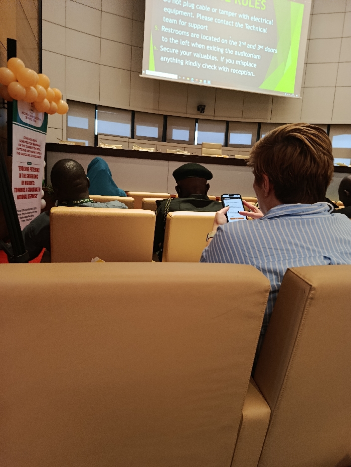 An interior view depicts an auditorium or conference room within an Immigration Quarters facility in Nigeria. The perspective is from behind rows of light beige upholstered chairs, with the immediate foreground occupied by the backrest of a chair. In the midground, at least four individuals are seated in similar chairs, facing forward towards a large projection screen. On the far right, a person with short, light brown hair, wearing a light blue and white striped shirt, is holding a black smartphone with both hands, actively interacting with its screen. To their left, a male individual is visible from behind, dressed in a dark uniform with shoulder epaulets and a dark peaked cap. Further to the left, another individual is seen from behind, wearing a dark top and a light green lanyard around their neck. Partially obscured behind this person is another individual wearing a light blue head covering. The background is dominated by a large white projection screen displaying text in green and white. Visible text includes event rules such as "DO NOT plug cable or tamper with electrical equipment. Please contact the Technical team for support," "Restrooms are located on the 2nd and 3rd doors to the left when exiting the auditorium," and "Secure your valuables. If you misplace anything kindly check with reception." Below the screen and above the seated attendees, horizontal windows or light panels with blinds are visible. A small, dark security camera is mounted below the projection screen. On the far left, a vertical banner or display stand is present. At its top, an orange balloon decoration is attached. The banner features the "NIGERIA IMMIGRATION SERVICE NIS" logo and details a "STAKEHOLDERS SENSITISATION SEMINAR ON THE EMERGENCE PATTERNS AND PHENOMENON OF THE SMUGGLING OF MIGRANTS TOWARDS A COORDINATED NATIONAL RESPONSE," dated October 19th-20th, 2023. The ceiling consists of light-colored acoustic panels.