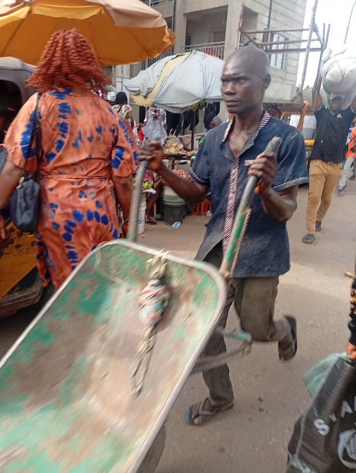 The scene depicts a bustling street market in the city of Onitsha, Nigeria. In the foreground, a bald adult male with dark skin, wearing a dark blue short-sleeved button-up shirt, dark trousers, and sandals, pushes a weathered, green-painted metal wheelbarrow. He grips the wheelbarrow's handles with both hands, and his gaze is directed slightly to his left. A small, multi-colored bundle is tied inside the wheelbarrow's basin, which exhibits rust and wear. To the left of the central figure, an adult female is seen from behind, wearing an orange dress with a blue tie-dye pattern and reddish-brown curly hair. She carries a dark handbag on her left shoulder and walks near a yellow vehicle component, possibly a fender. Further into the mid-ground, an orange market umbrella and a lighter-colored market umbrella shade stalls displaying produce, including bananas. In the background to the right, an adult male in a dark shirt and light brown trousers walks while balancing a large, white, bulky sack on his head. Multi-story buildings with balconies are visible in the background, along with additional indistinct figures. The ground is a paved surface.