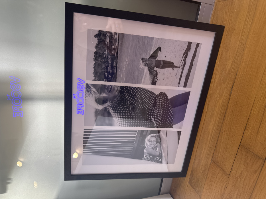 A black-framed triptych photograph is displayed on a polished wooden floor, leaning against a light-colored wall within a room in Paleo Faliro, Greece