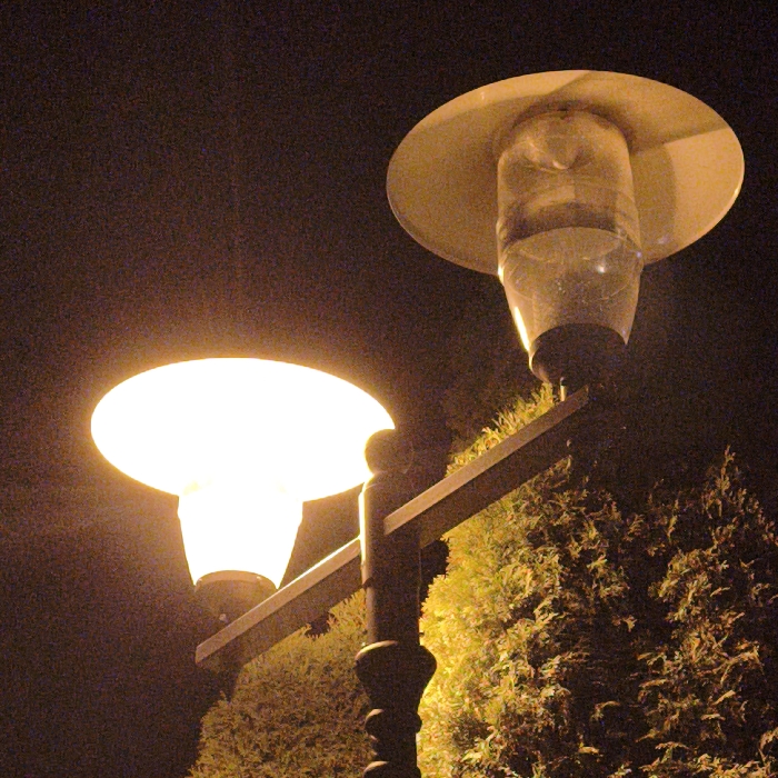 The image displays a nighttime outdoor scene featuring a twin-headed street lamp pole