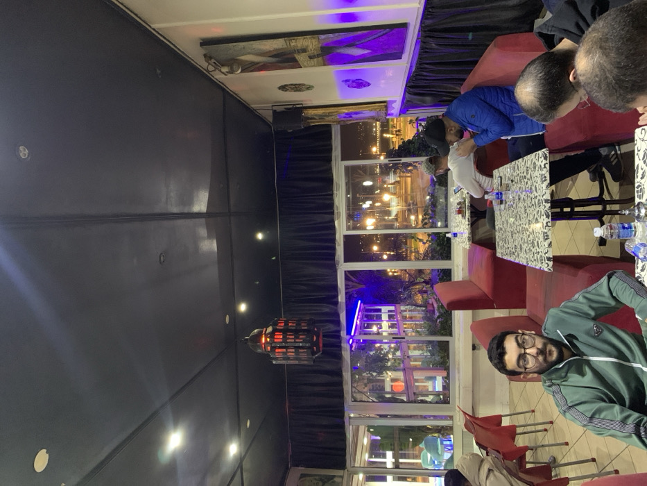 A group of men sit at tables in a restaurant with large windows offering a night view. The interior features dark walls and ceilings with hanging lanterns. Red seating is arranged around tables with patterned tops. Several water bottles are visible. One man in a green tracksuit and glasses faces the camera. The overall atmosphere appears to be a casual, dimly lit gathering.