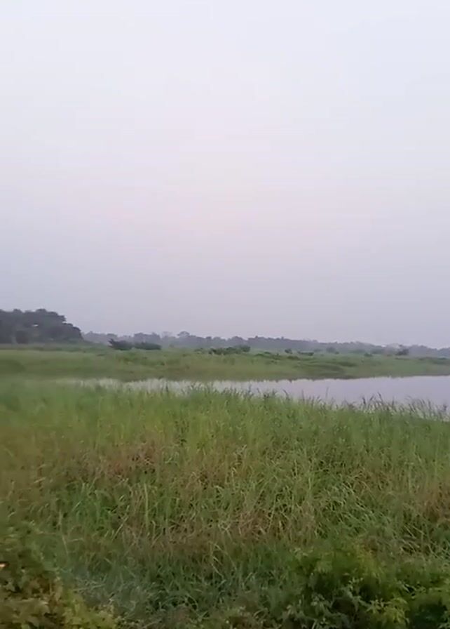 rural landscape with a body of water surrounded by tall grass in the background. The sky is overcast. The camera then moves to the right, revealing a plowed field with rows of young plants. In the distance, there are trees and figures that appear to be people.