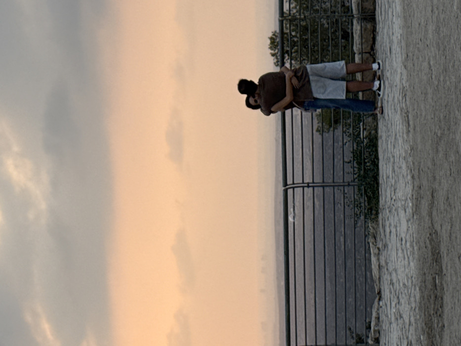 The image depicts an outdoor scene at dusk or twilight, located within the Mate Yehuda Regional Council, Israel. Two individuals are embracing in the foreground on an uneven, light-colored paved surface. An adult male, wearing a dark brown short-sleeved shirt and light shorts with dark shoes, stands with his back mostly to the viewer, his arms wrapped around an adult female. The female, wearing a dark top and blue jeans with sandals, faces him, her left profile visible, her arms also wrapped around him. Behind them, a dark metal railing with multiple horizontal bars stretches across the mid-ground, with some green foliage visible behind it on the right. Beyond the railing, a vast, hazy landscape with indistinct distant structures extends to the horizon. The sky above is characterized by grey clouds at the top, transitioning to soft orange and pink hues near the horizon.