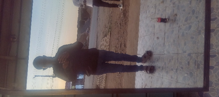 A full body shot of a man in jeans, a dark jacket, and sandals, is the central focus. He stands on a tiled surface with a bottle nearby. Beyond the tiles, there's a glimpse of a beach or sandy area. Additional figures are present further back. The image is framed by what appears to be a window or doorway. The scene is outdoors under a bright sky, likely during daylight.