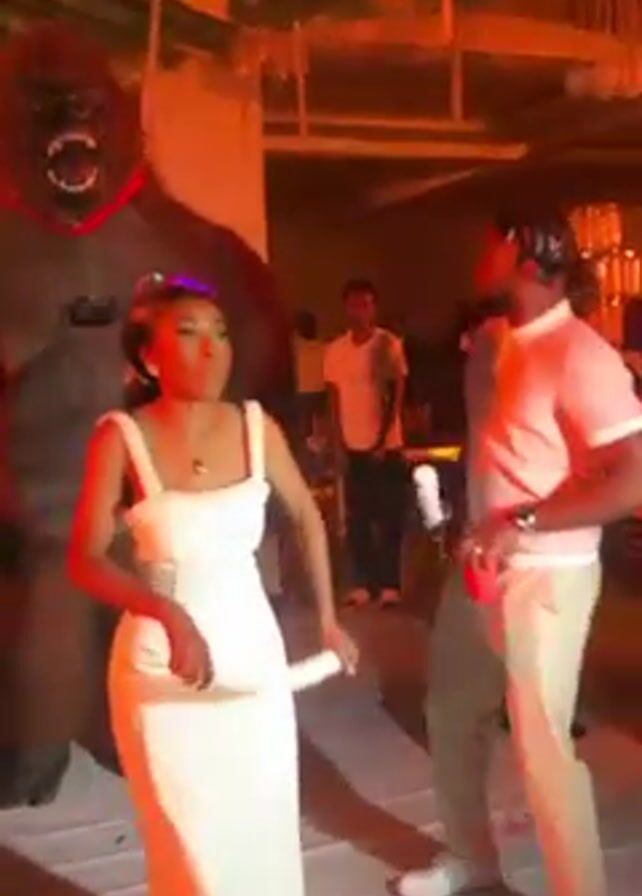 A low-angle video shows a woman and a man dancing, each holding a white pool noodle. The woman is wearing a long white dress with thin straps. The man is wearing a short-sleeved pink shirt, khaki pants, and white shoes. Behind them is a large, menacing-looking animatronic gorilla with its mouth open. In the background, several men are standing near tables and chairs. There are white and blue decorations hanging from the ceiling. The lighting is dim, with a red tint.