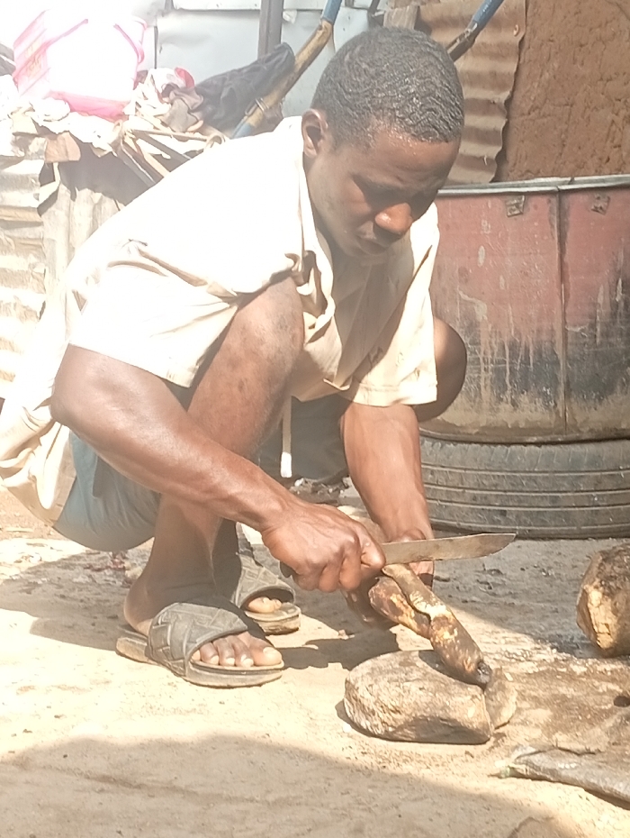 An adult male with dark skin and short, dark, wavy hair is observed in a squatting position outdoors in an informal setting within Abuja, Nigeria. He wears a light-colored, possibly beige, short-sleeved shirt, dark lower garments, and black slide sandals. He is actively peeling a dark-skinned, elongated tuber or fruit, consistent with a plantain or yam, using a metal-bladed knife held in his right hand. His left hand steadies the item, which rests on a flat, dark rock on the light brown, dusty ground. Another similar unpeeled item is visible on the ground to the right. The background includes a pile of light-colored, crumpled material to the upper left, a reddish-brown corrugated metal sheet wall or partition, and to the far right, a large, dark red metal barrel and a worn car tire. Strong sunlight illuminates the scene.
