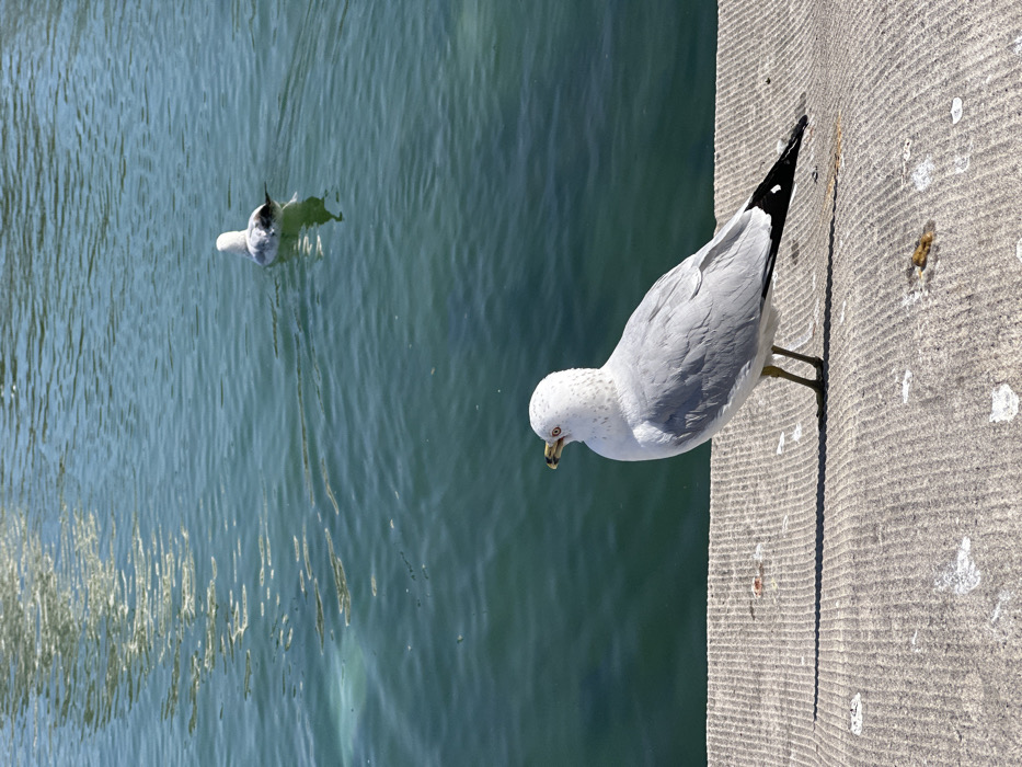 The scene depicts an outdoor waterside environment at the Tidal Basin in Washington, D.C., United States of America, under clear daylight conditions. In the foreground, a single adult Ring-billed Gull (*Larus delawarensis*) stands on a light grey concrete ledge. The gull exhibits white plumage on its head and underparts, a grey back, and distinct black primary wingtips on its folded wings. Its yellow beak features a prominent black band, and its eyes display reddish-orange irises. The bird is oriented with its body facing left and its head slightly turned towards the water. A sharp, elongated shadow from the gull extends to its left across the concrete surface, which is textured with parallel grooves and marked by several scattered white and brownish avian droppings. In the upper right background, a second Ring-billed Gull floats on the teal-blue water, positioned with its back towards the viewer. The water's surface is characterized by ripples and distinct reflections of sunlight.