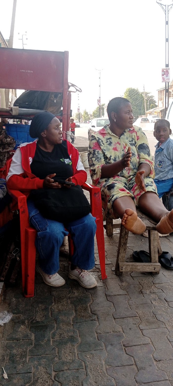 The image depicts a daytime scene on a paved sidewalk in Kwachiri, Nigeria, adjacent to a public roadway. In the foreground, three individuals are present. On the left, a woman with dark skin wears a black head covering, a red and white jacket over a black graphic t-shirt, and blue jeans with light-colored sneakers. She is seated on a red plastic chair, holding a black smartphone. A black bag rests on her lap. Next to her, a second woman with dark skin, wearing a patterned yellow, pink, and dark-colored dress, sits on a low wooden stool. Her bare feet rest on the pavement, and her hands are raised and open in a gesture consistent with speaking. To the right of the second woman, a young child, partially visible, wears a light blue and white checkered shirt with a blue bow tie and blue trousers. The child looks towards the right. Behind the first woman, a red metal structure, possibly part of a truck or stall, bears the white stenciled text "LINK-12-2024". A blue plastic drum is visible below this structure. The ground consists of dark grey interlocking paving bricks, with scattered debris like a plastic bag and a white stick. In the midground and background, a roadway is visible with white vehicles. Multiple street light poles with attached banners (one featuring a portrait) line the street. Distant buildings and trees are present under a bright, possibly hazy, sky. A child in a red shirt is visible in the distant left background near the road.
