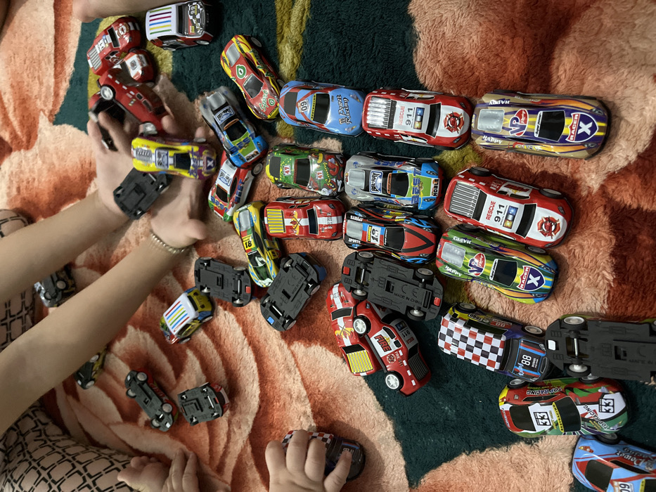 - "The image displays an indoor scene in Gampongjawa, Indonesia, where two individuals are playing with a collection of numerous miniature toy cars on a patterned floor covering" by FM-NRX8S2, licensed under CC BY 4.0