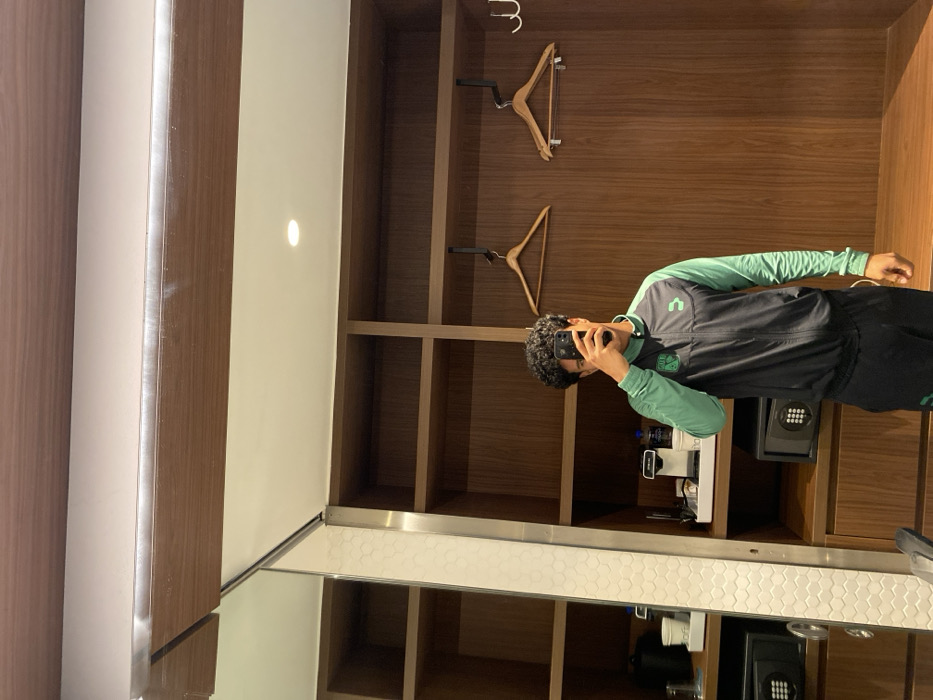 A man with curly hair takes a selfie in front of a wooden shelving unit with two hanging coat hangers. The shelving unit contains a mini-fridge, coffee maker, and a safe. The man wears a black and green athletic jacket with matching pants. A mirror on the bottom reflects the shelving unit and items it contains.