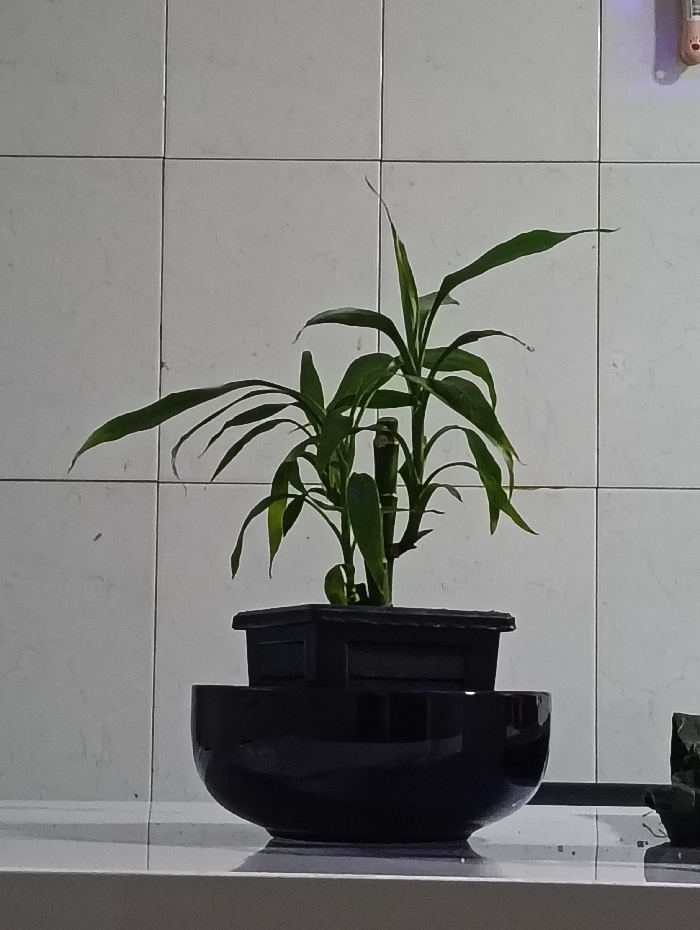 The image displays an indoor scene in Nairobi, Kenya, centered on a small plant arrangement. A green-leafed plant, characterized by slender stems and elongated leaves, is situated within a small, square, black plastic planter. This planter is nested inside a larger, glossy black, hemispherical bowl, which rests on a reflective, light-colored flat surface, possibly a countertop. The background is composed of a white tiled wall, featuring visible horizontal and vertical grout lines. The tiles show minor surface irregularities. A partial view of a light-colored object, potentially a wall fixture, is visible in the upper right quadrant of the image. No individuals are present, and no actions or interactions are depicted.