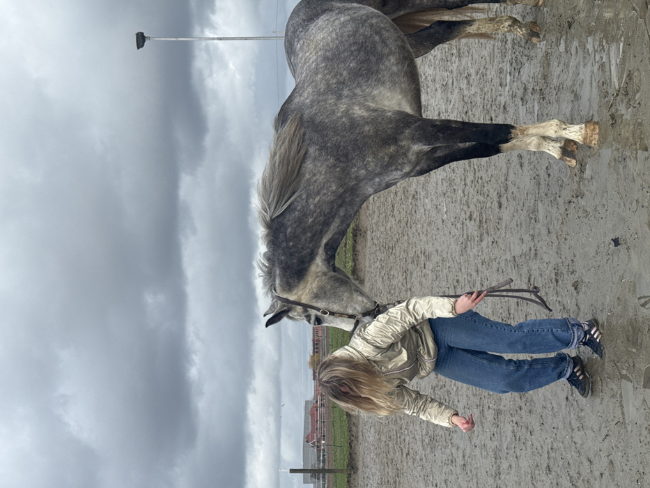 This image captures a scene in Estaimpuis, Belgium, under an overcast sky. A young adult female and a dapple-grey horse are positioned in a muddy outdoor paddock. The female, with light-colored hair covering her face, is wearing a metallic gold puffer jacket, blue jeans, and black sneakers. She is bent forward, holding a brown leather lead rope in her right hand. The horse, adorned with a brown leather bridle, has its head lowered and turned towards the female's head/shoulder area, appearing to make contact. The ground consists of wet, dark mud with visible tracks and shallow puddles. In the background to the left, a fence line borders a green field, beyond which are distant buildings with red roofs. A tall, slender grey utility pole with a dark cap is visible on the right against the grey sky.