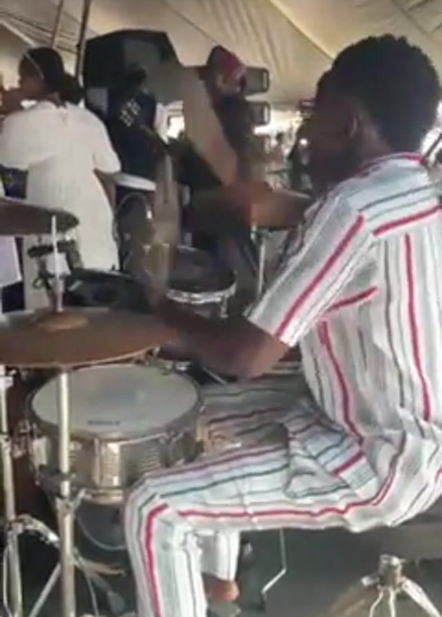 drummer playing in a band, likely at an outdoor event or under a tent. He is a young man with dark hair, wearing a striped shirt and matching pants, and glasses. He is seated behind a drum set, which is positioned on a stage or platform of some kind. Other people are visible in the background, including singers and other musicians. Some people are dressed in white clothing. Speakers and other equipment are also visible. The overall atmosphere seems lively and energetic.