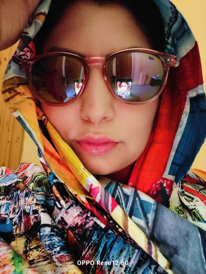 A close-up portrait depicts a woman in an indoor setting in Cuéllar, Spain. She is adorned with a multi-colored headscarf, exhibiting an abstract pattern primarily in red, blue, yellow, and white. She wears pink-framed, round-lensed sunglasses, completely obscuring her eyes. A small silver stud is visible on her right nostril. Her lips are finished with a pink lip gloss. Reflections within both sunglass lenses show an individual holding a smartphone, with the device's screen displaying an image of the subject. The background within these reflections reveals a plain, light-colored wall, a wooden door frame, and a dark object situated on the floor. A 'OPPO Reno12 5G' watermark is located at the bottom of the frame.