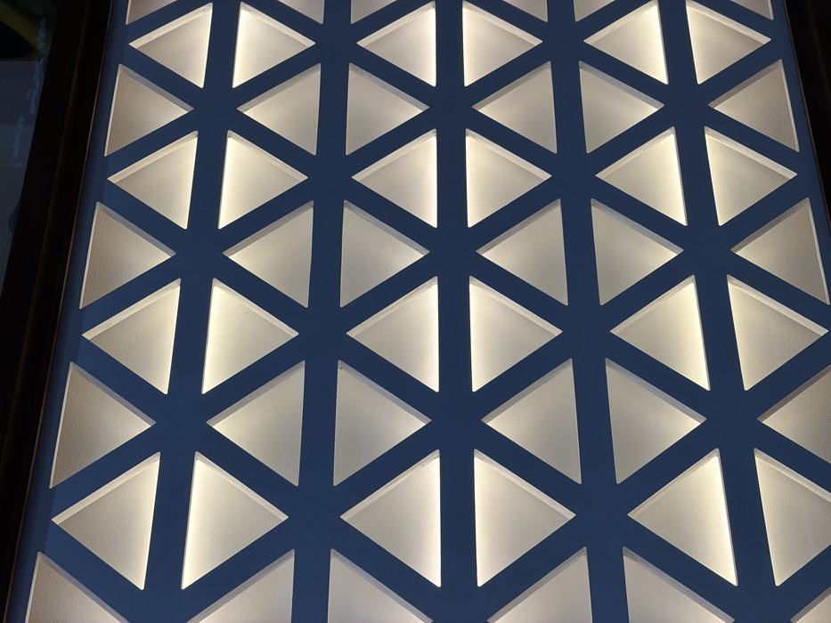 A close-up, angled view depicts a decorative interior wall panel in Maafushi, Maldives. The panel features a dark blue surface embedded with a tessellating pattern of illuminated triangular recesses. Each triangular cavity contains a warm white light source, creating a glow that highlights the three-dimensional form of the individual triangles and provides a soft gradient illumination across their inner surfaces. No individuals, additional objects, actions, or interactions are present in the scene.