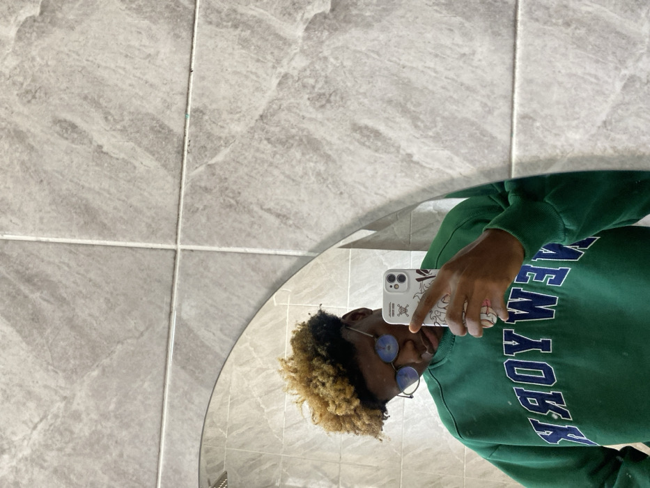 An individual is captured in a mirror selfie within an indoor setting. The subject, a person of color with dark skin, exhibits short, curly hair that is dark on the sides and transitions to a light blonde or golden-brown on top. They are wearing round, dark-rimmed glasses with dark lenses. The individual is dressed in a dark green crewneck sweatshirt featuring the word "NEW YORK" in white or light blue block letters, which appears as "KROY WEN" due to the mirror's reflection. The subject is holding a white smartphone, likely an iPhone given the dual camera lenses, with their right hand. The phone case is transparent or white, adorned with various black and white graphical elements, including skull and crossbones motifs. The hand holding the phone shows visible fingers wrapped around the device. The background consists of light gray or beige rectangular wall tiles, horizontally and vertically aligned, with prominent grout lines. The tiles feature a subtle, irregular marbled or stone-like pattern. A portion of a polished, rounded mirror, possibly oval, occupies the central left and bottom portions of the frame, reflecting the subject and part of the room. The specific location in the city of Igboefon, Nigeria, cannot be determined from the visual information present in the image.