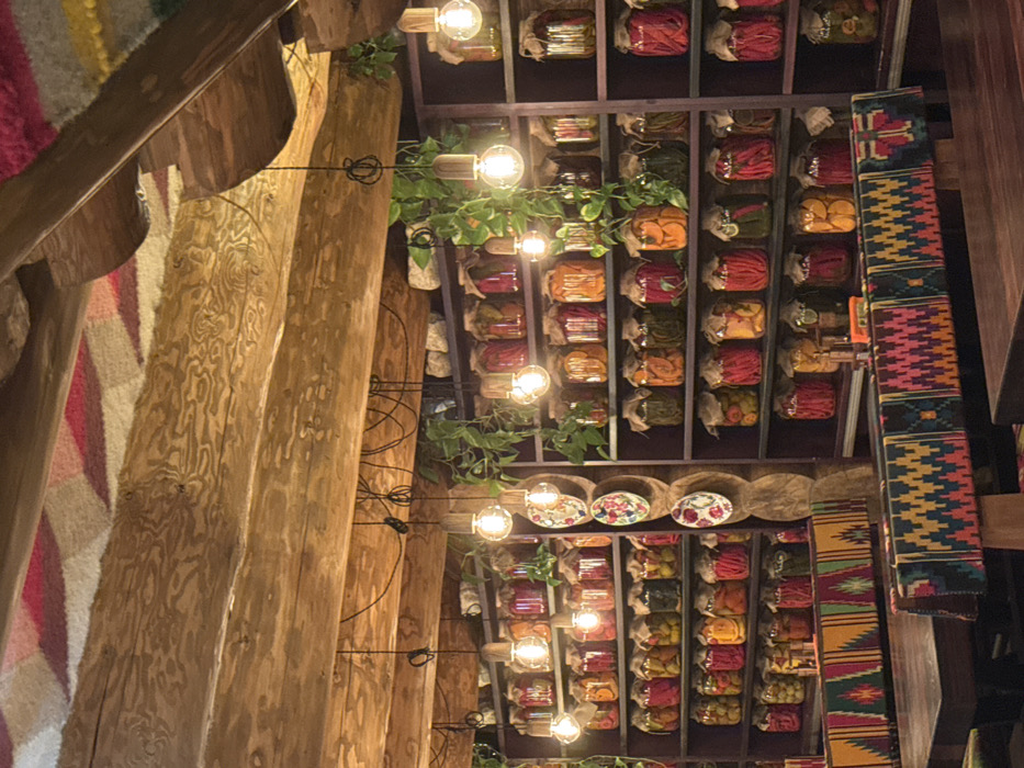 This image depicts an interior view of a restaurant or eatery located in Polianytsia, Ukraine. The ceiling features heavy, rough-hewn wooden beams with visible grain patterns, from which multiple pendant light fixtures with exposed filament bulbs are suspended by black cords. Sections of the ceiling are covered with woven textiles displaying geometric patterns in red, pink, white, and beige. The walls are lined with dark wooden shelving units, densely filled with hundreds of clear glass jars containing various preserved foods, predominantly pickled vegetables such as cucumbers, red peppers, and other colorful produce. Many jar lids are covered with light-colored fabric or paper secured with string. Green leafy vines are draped over and between the shelves, adding foliage to the display. Small, irregular stones are visible on the topmost shelves in various sections. A central wooden column or divider displays several decorative ceramic plates with floral motifs arranged vertically. In the foreground, dark wooden tables are paired with benches, both adorned with vibrant woven textile coverings or runners featuring intricate geometric patterns in multiple colors. No individuals are present in the scene.