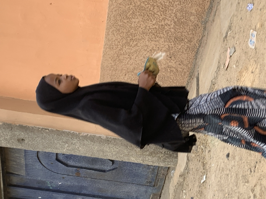 A young individual, identified as female, is depicted in profile, walking from left to right on a dirt path in Gawuna, Nigeria. She wears a black hijab covering her head and upper torso, and a long, patterned skirt with black, white, and orange geometric designs. Her visible left hand holds a small, light-colored object, possibly a pouch or wallet, with white material protruding. The background on the left features a weathered dark blue door with an arched design, set into a grey, textured wall. To the right, an orange-peach colored wall with a stucco-like texture is visible. The ground is a light brown dirt surface, strewn with small pieces of debris and litter.
