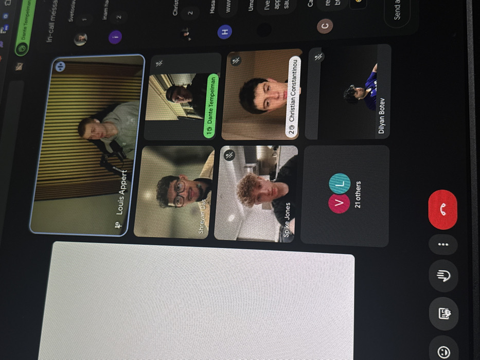 The image displays a computer monitor rendering an active video conference application interface. No visual information within the image definitively indicates a specific physical location in Sofia, Bulgaria, or any other city. The screen is dominated by a grid of participant video feeds on the right and a large, unpopulated white panel on the left. The top video feed shows "Louis Appert," a young male in a light-colored hoodie, speaking into a black microphone; his background consists of vertical light brown wooden slats. Below him, "Shreyan Das," a young male with glasses, is visible against a plain background. To the right of Shreyan Das is "Dante Tempelman," a young male wearing a dark head covering and dark clothing, with a dimly lit background. Below Shreyan Das is "Spike Jones," a young male with curly blond hair wearing a black t-shirt, positioned in front of a modern kitchen or open-plan living area. To the right of Spike Jones is "Christian Constantinou," a young male with dark hair, looking downwards. Below Spike Jones, a tile indicates "21 others" participating in the call. In the bottom-right grid position, "Dilyan Botev" is depicted as a still image or avatar of a young male with dark curly hair, wearing a purple and white sports jersey. User interface elements include participant names under each video, small microphone and camera icons (some crossed out), and a partially visible "In-call messages" panel on the far right listing names and message fragments. The bottom control bar features icons for emojis, raising a hand, additional options, and a prominent red phone icon for ending the call. The overall interface theme is dark.