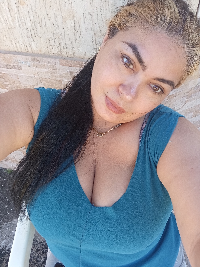 A woman poses for a selfie. She has light brown eyes, full lips with nude lipstick, and blonde hair with dark streaks. She wears a teal V-neck top and a gold necklace. Her cleavage is visible. The background features a textured wall and glimpses of greenery below. The photo is taken in natural lighting.