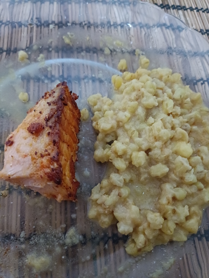 The scene, situated in Sagunto, Spain, displays a close-up overhead view of a partially consumed meal presented on a clear, round glass plate featuring a subtle fluted or wavy rim. Positioned on the left side of the plate is a triangular portion of cooked fish, consistent with a salmon fillet, exhibiting a distinct browned, seared crust with visible seasoning, and a lighter orange-pink interior. To its immediate right, a substantial mound of pale yellow, granular substance, consistent with a mashed or stewed vegetable dish, occupies the majority of the plate's right area. Scattered liquid residue and small food particles are observable on the transparent glass surface, indicating prior consumption or food preparation. The plate rests directly on a surface covered by a placemat or mat characterized by a pattern of alternating dark and light, roughly horizontal, parallel lines. No individuals or specific actions are depicted.