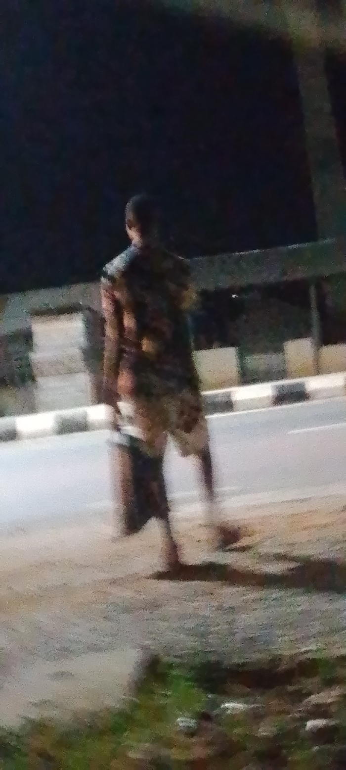 This image depicts a single individual walking away from the camera in Zango-ndaji, Nigeria, during nighttime hours. The person, appearing to be an adult or adolescent male, is dressed in a patterned, possibly camouflage, shirt and shorts. They are observed carrying an indeterminate object in their left hand, consistent with a bag or container. The subject's posture indicates forward motion, resulting in motion blur. To the subject's right is an asphalt road surface with clearly visible white and black striped lane markings. To the subject's left is an unpaved shoulder or dirt area with minimal, sparse green vegetation in the lower left foreground. In the background, across the road, a low-profile barrier or structure is present, beyond which the environment is dark and indistinct, suggesting obscured buildings or natural features. The scene is illuminated by artificial light sources, creating areas of highlight and deep shadow, consistent with a low-light photographic condition, contributing to the overall grainy and blurry quality of the image.