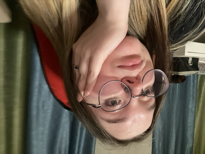 A single female subject is depicted indoors, likely within a residence in Kolomna, Russia. The subject, appearing to be a young adult with fair skin, long brown hair with lighter ends, and wearing round-rimmed eyeglasses, is positioned with her right hand supporting her jawline. A dark ring with a central stone is visible on her right ring finger. Her gaze is directed upwards and slightly to her left. Behind the subject, a red upholstered surface, possibly a chair back, is visible to the right. The background features vertically striped curtains in shades of teal, blue, and muted green. To the subject's left, a light-colored surface, possibly a desk or shelf, holds a dark bag or case with a silver clasp, and a rolled-up dark textile item.