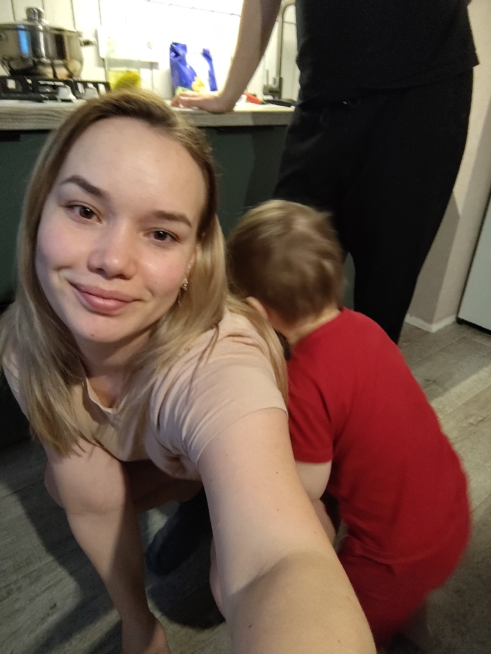 This image depicts an indoor scene within a kitchen located in the city of Марковский, Russia. In the foreground, an adult female with blonde hair, wearing a light-colored short-sleeved top, is crouched or kneeling and smiles while looking directly at the camera, indicative of taking a selfie. To her immediate right and slightly behind her, a young child wearing a red short-sleeved top and red pants is partially visible from the back, leaning close to the female subject. In the background, a third individual is partially visible from the torso down, wearing black pants and standing behind the child, with one arm resting on a dark teal countertop. On the countertop to the left, a blue bag with yellow contents and a small light green object are visible. Further to the left, a stainless steel pot with a lid rests on a gas stovetop, backed by light-colored wall tiles. The floor throughout the visible area is a light-toned, possibly laminate or tile, material.