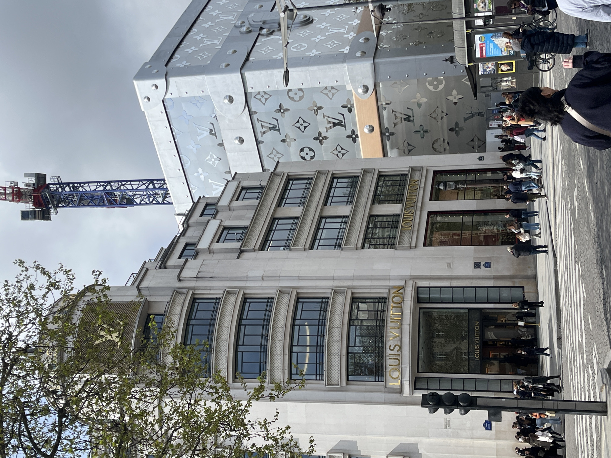 The image captures a street scene in Paris, France, featuring the Louis Vuitton store at 2 Place Vendôme, 75001 Paris, France