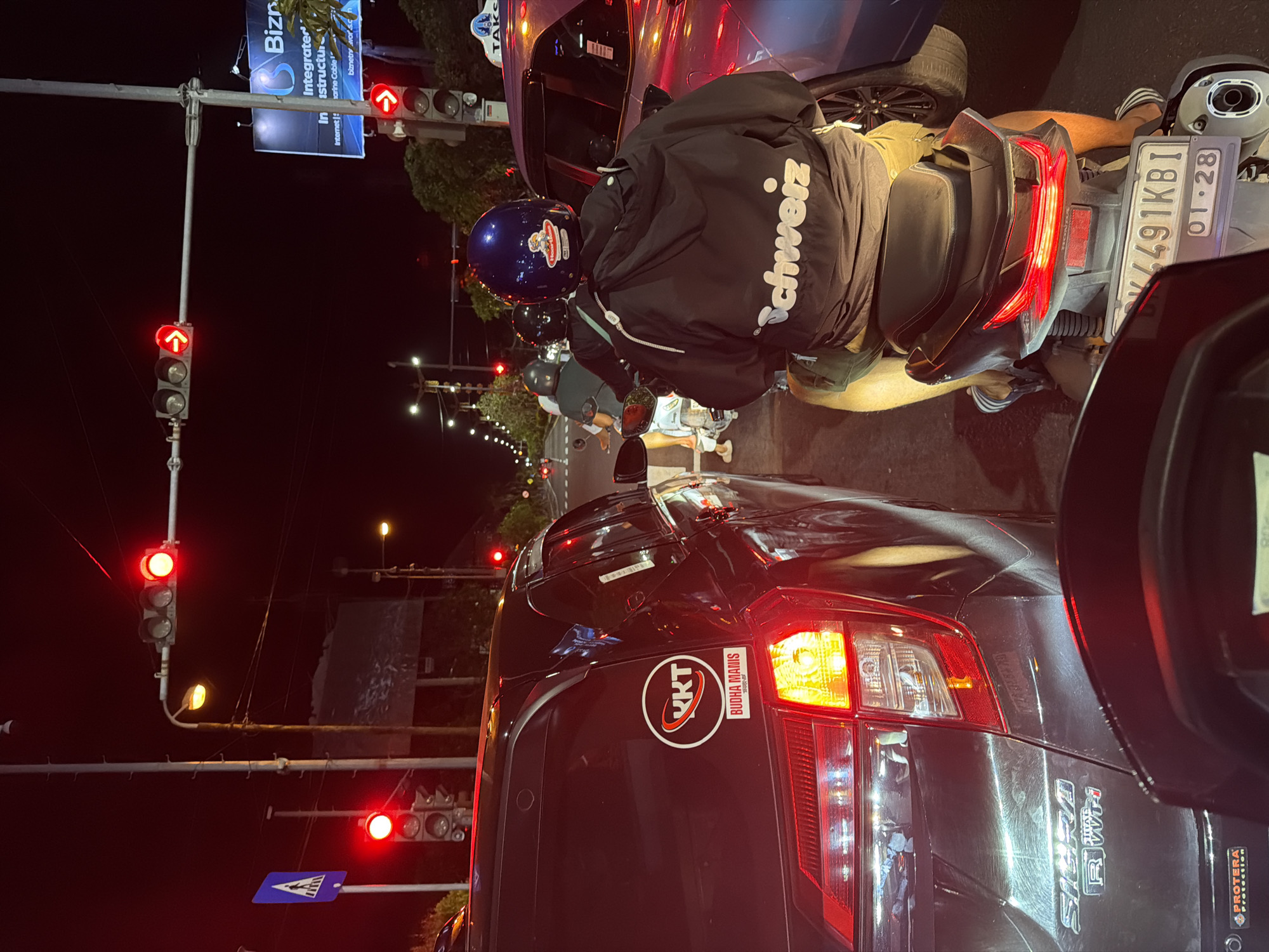 The image depicts a night scene at a traffic stop in Nusa Dua, Indonesia. Several vehicles are stopped at a red traffic light, including a dark-colored minivan with the words "SIERA RW" and the logo "VKT BUDHA MANIS" on its rear. Adjacent to the minivan is a motorcycle with the license plate "DK 4491 KBI". The motorcyclist, wearing a blue helmet and a black jacket with the word "Schweiz" emblazoned on the back, is waiting at the intersection. A sign with the text "Bizn Integrated" is visible near the traffic light. Other vehicles and lights line the street in the background.