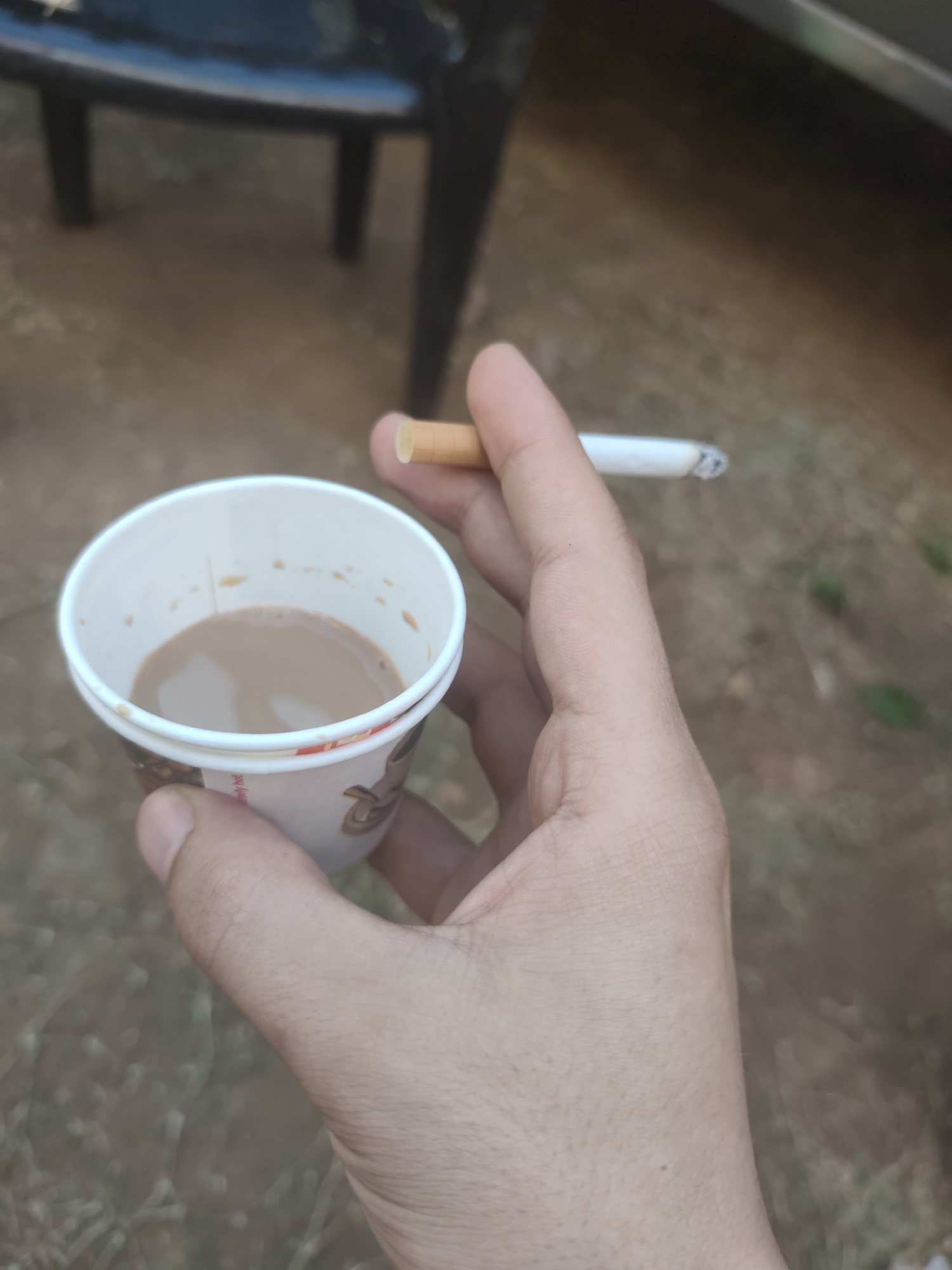 A hand holds a paper cup with light brown liquid, possibly tea or coffee, while simultaneously holding a lit cigarette between the index and middle fingers. The background is blurry, but suggests an outdoor setting with glimpses of a chair and possibly a vehicle. The location is Kolhapur, India.
