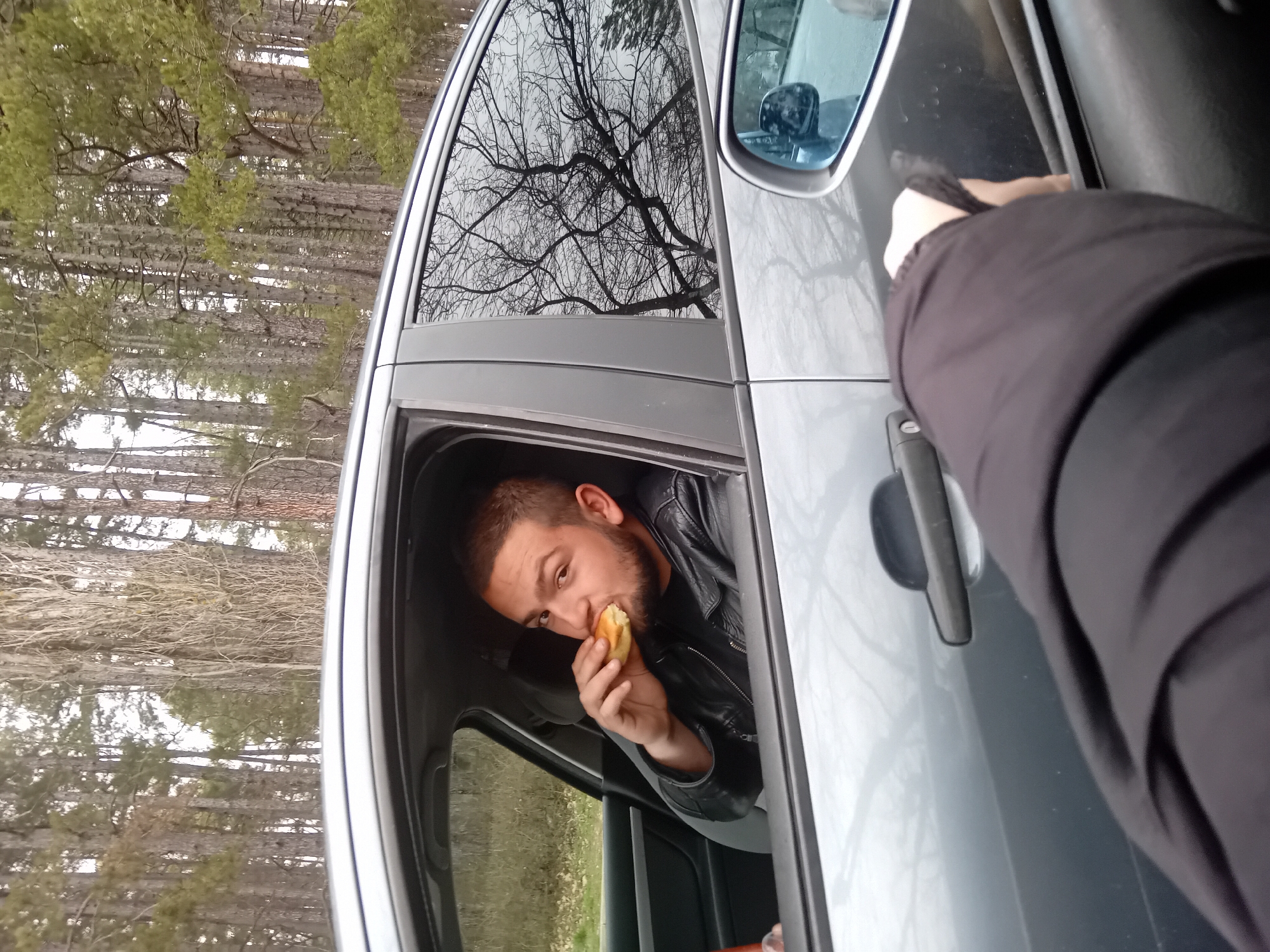 The image displays an outdoor scene, location Unknown, Unknown. A grey four-door sedan is positioned adjacent to a dense wooded area. A young adult male, with dark hair and a short beard, is seated in the driver's seat of the sedan, looking towards the camera. He is wearing a black leather jacket and is actively consuming a light-colored bun or pastry, holding it to his mouth with his right hand. The driver's side front window is lowered. In the immediate foreground, a human right arm and hand, clad in a dark, possibly padded jacket sleeve, are visible, resting on the interior trim of an unseen vehicle's door panel. The background features numerous tall, slender trees, consistent with a pine or conifer forest, under an overcast sky. Reflections of bare tree branches are visible in the rear passenger window of the sedan. A portion of a road or dirt path is faintly visible to the left of the grey vehicle.