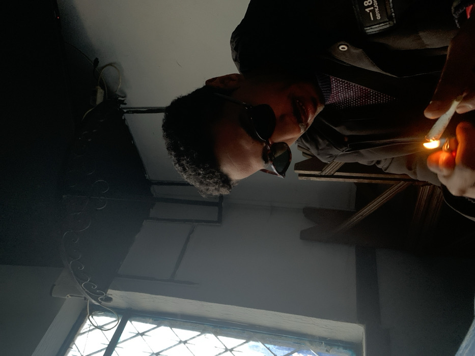 A man in sunglasses, a patterned tie, and a jacket lights a cigarette or joint with a lighter. He is in a room with a window, and there is dark decor and a light-colored wall. The image is dark, likely taken indoors, and tilted.