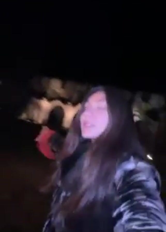 woman with long brown hair standing next to a lit Christmas tree outdoors at night