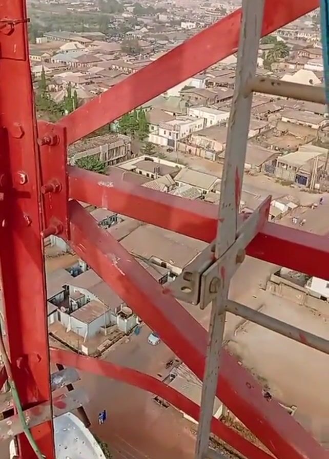 The video presents a view from atop a red steel tower, likely a communication or broadcast tower, with a ladder attached