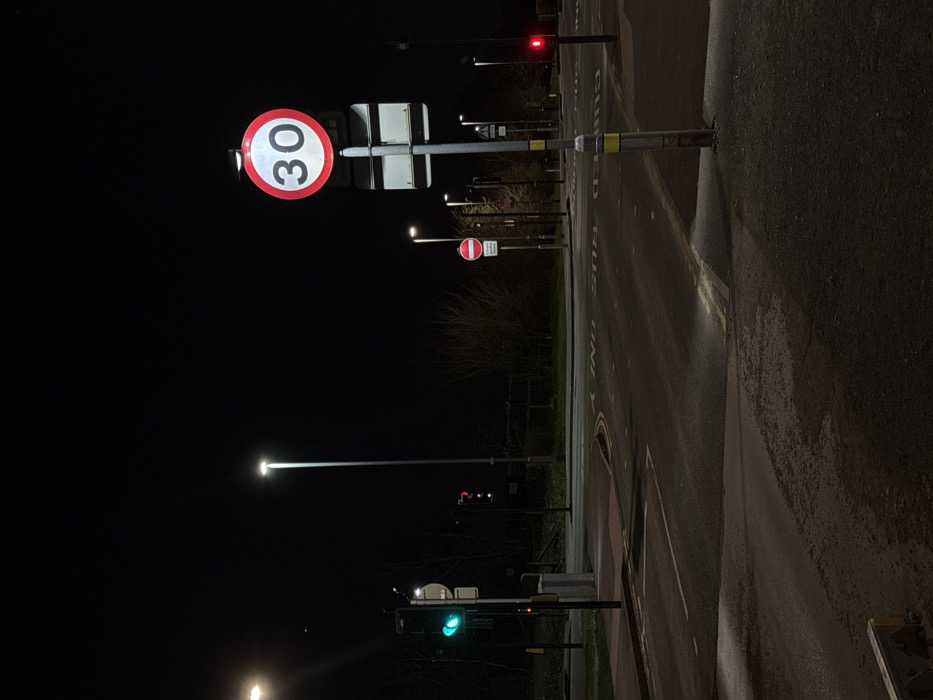 This image depicts a nighttime scene at a road intersection in Wigan, United Kingdom, illuminated by artificial light sources. The perspective is from a paved area looking across an asphalt road intersection. The environment is dark, with a clear black sky. Numerous tall, grey streetlights with bright white illumination are spaced throughout the scene, casting light and shadows onto the road and surrounding areas. In the foreground, slightly right of center, a prominent circular red-bordered "30" speed limit sign is mounted on a tall grey pole. Below it are two rectangular white signs. To the far left, a traffic light displays a green signal for vehicles, situated on a pole next to a pedestrian signal. Further back and to the right, another traffic light displays a red signal. In the mid-ground, a circular "No Entry" sign (red circle with white bar) is visible on a pole on the right side of the road. The asphalt road features various white and yellow markings. Inverted text on the road surface reads "BUS ONLY" and "GUIDED BUS," indicating dedicated lanes. White arrows and double yellow lines are also visible. The pavement on the left includes a grey waste bin near the base of the green traffic light pole. The background features dark, bare trees or shrubs. No people or vehicles are visible within the frame.
