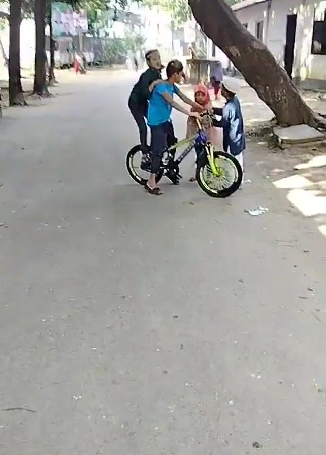 Four children are gathered around a bicycle on a paved road. Three boys wear kufis. The bicycle is blue and yellow. One boy is sitting on the seat, and another is standing behind him, supporting him. A girl in a pink hijab is standing in front of the bike, and a boy to the right of the bike is helping to hold it up. There are trees on either side of the road, and buildings in the background. There is trash on the ground to the right of the bicycle.