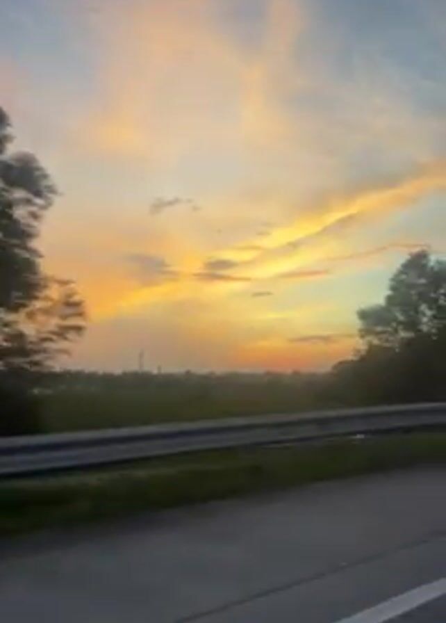 view from a car traveling on a road, looking out at the sky at sunset. Trees and streetlights are visible alongside the road. The sky is a mix of blue, orange, and yellow hues.