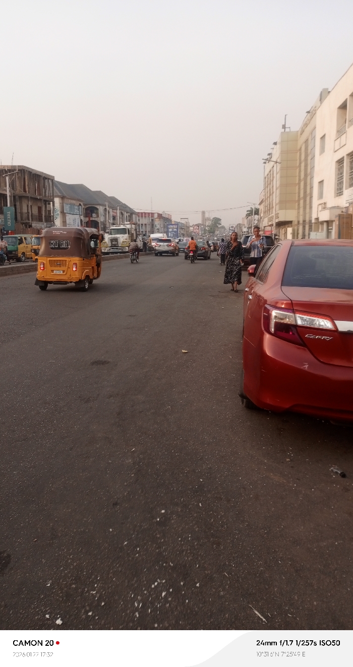 An urban street scene shows a yellow auto rickshaw moving away, with a red sedan parked on the right side of the road. Several people are walking along the street, and other vehicles can be seen further down the road. Buildings line the streets, creating a city atmosphere. The photo's metadata indicates it was taken with a CAMON 20 at 24mm, f/1.7, 1/257s, ISO 50, at specific coordinates on what appears to be January 17, 7326.