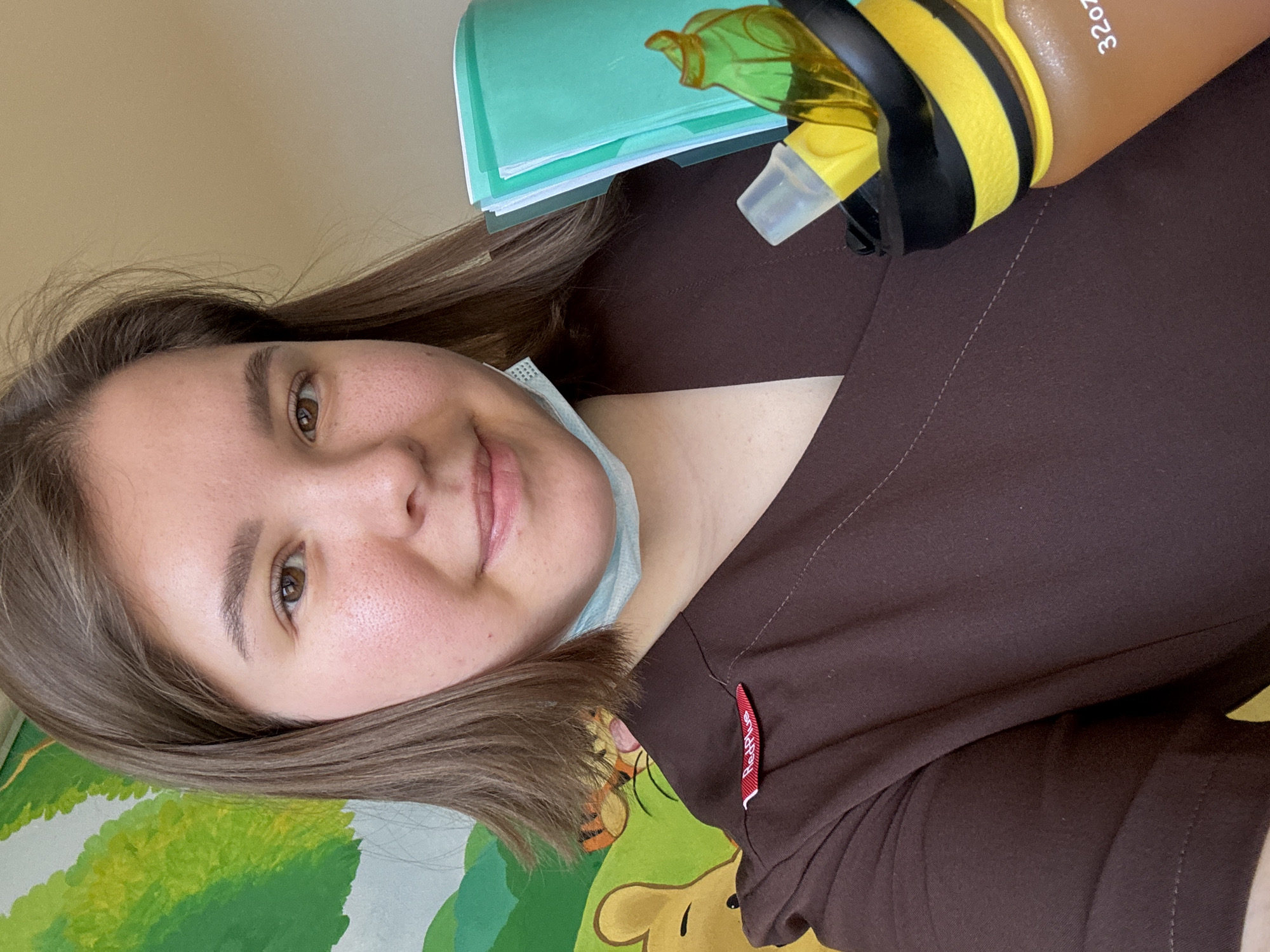 A woman is depicted in a selfie. She has brown hair, fair skin, and is wearing a brown scrub top. A blue medical mask is loosely hanging around her neck. She is smiling and looking at the camera. A water bottle with yellow and black stripes is positioned near her. Stacks of paper are stacked to the side. In the background is a colorful children's mural, possibly a Winnie the Pooh theme. There is no evidence that the photo was taken in Kazan, Russia.