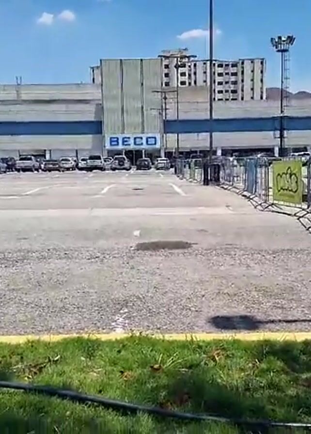 parking lot on a sunny day. The parking lot is mostly empty. Buildings can be seen in the background. There are a few cars parked. A patch of grass is in the foreground with a black hose. Some metal barriers with signs on them are visible.